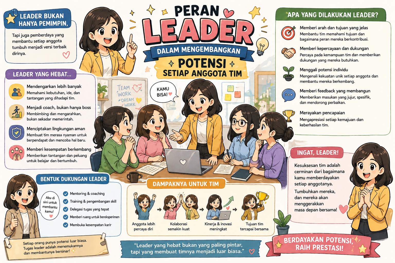 Peran leader dalam mengembangkan potensi setiap anggota tim menjadi kunci dalam membangun tim yang kuat. Banyak organisasi memiliki anggota tim yang berbakat, tetapi potensi tersebut tidak berkembang karena kurangnya arahan dan dukungan.