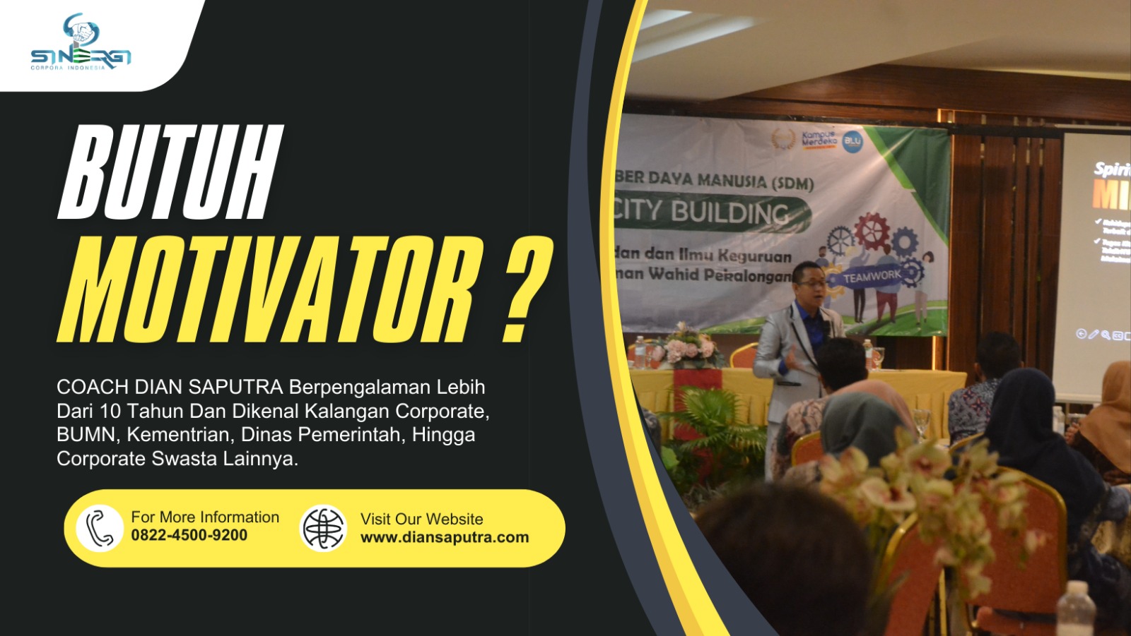 Coach Dian Saputra adalah Founder Sinergi Corpora Indonesia, seorang Motivator, Corporate Trainer, sekaligus Spiritual Life Coach yang telah aktif di dunia pelatihan dan pengembangan SDM sejak tahun 2011. Sebelum terjun penuh di dunia training, beliau memiliki pengalaman profesional di salah satu BUMN, sehingga memahami tantangan nyata dalam dunia kerja dan organisasi.